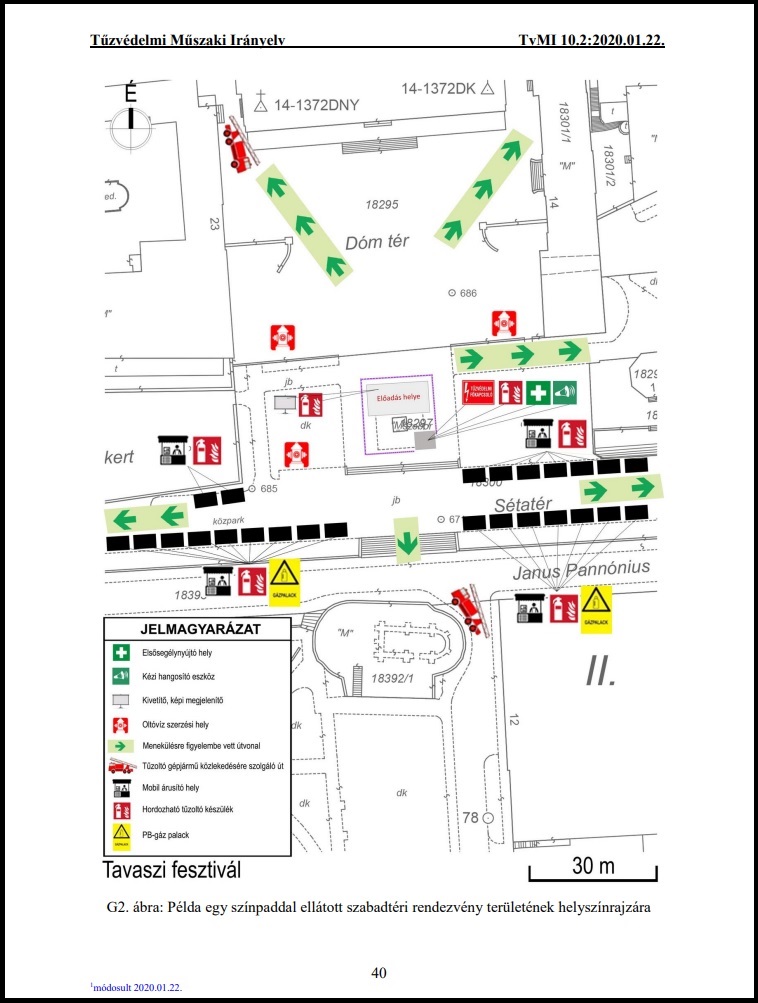 A tavasz megérkeztével és a világjárvány enyhülésével járó korlátozások lazítása, ismételten lehetővé teszi szabadtéri rendezvény megrendezését. Ezen rendezvényeken biztosítani kell a nem várt események bekövetkeztekor a veszélyeztetett terület elhagyását, a személyek biztonságos területre jutását. A Szabadtéri rendezvény és Kiürítés TvMI részletesen kitér a tűzvédelmi előírásokra. Valamennyi fent említett rendezvény területén javasolt léptékhelyes, színes nyomtatású, az időjárásnak ellenálló kivitelű alaprajzok kihelyezése. Kihelyezésénél tekintettel kell lenni a menekülésre figyelembe vett útvonalakra és azon helyekre, ahol a résztvevők koncentrálódása várható. A kihelyezett léptékhelyes alaprajzokon legalább a menekülést és eligazodást segítő rajzi elemeket, a menekülésre figyelembe vett útvonalakat javasolt feltüntetni. Javasolt, hogy a kiemelt zenés, táncos szabadtéri rendezvény OTSZ 216. § (5) bekezdése által meghatározott pontjain kihelyezett léptékhelyes alaprajz színes és az időjárásnak ellenálló kivitelű legyen. Mérete minimum 1200×600 mm.